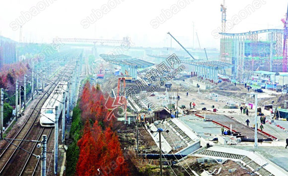 作为沪宁城际铁路苏州工业园区站站房的配套交通设施,城铁园区站配套工程总建筑面积约3.3万平方米,主要包括出站地下空间、高架进站平台以及站前地面广场,目前工程进展顺利,车站已现雏形。图为一列动车组从站台旁驶过。(记者 濮建明)