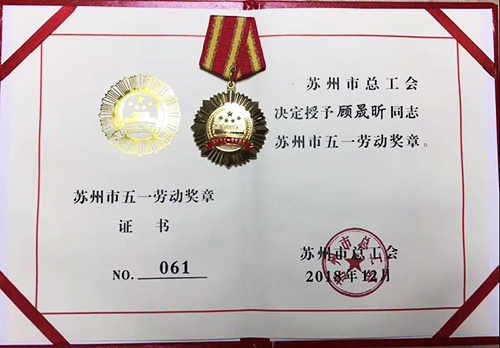 2018年12月,为加快建设知识型、技能型、创新型职工队伍,表彰先进,弘扬技能标兵,由苏州市总工会授予2018年度市级技能竞赛优秀选手苏州市五一劳动奖章的评选圆满画上句号。苏州市总工会共授予75名各行各业职业技能优异的同志“苏州市五一劳动奖章”荣誉称号。
