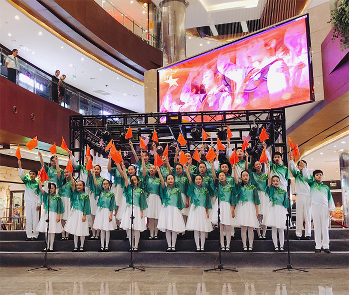 2019年是中国共产党成立98周年,是新中国成立70周年,也是新2皇冠登录·花季艺术团成立10周年。7月27日下午,新2皇冠登录·花季青少年艺术团合唱团走进苏州新2皇冠登录星座购物中心,为大家带去了精彩而又有创意的快闪演出。当天下午两点半刚过,熙熙攘攘的商场里突然响起了大家耳熟能详的《我和我的祖国》主旋律,购物的人们都驻足聆听,四处张望,期待着惊喜。这时,人群中走出29名身着白绿色中式礼服孩子,他们手拿小国旗,脸上洋溢着灿烂笑容,他们从商场的各个角落缓缓走出,最后汇聚到舞台,一连为观众带去了《我和我的祖国》、《童心向党代代传》及《我们是共产主义接班人》三首经典红色歌曲,赢得现场围观群众的阵阵掌声和喝彩。当天,户外的瓢泼大雨与孩子们优美的歌声相呼应,撩动着人们夏日的激情,给大家带来了一场爱国主义的视听震撼。