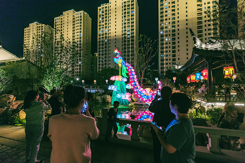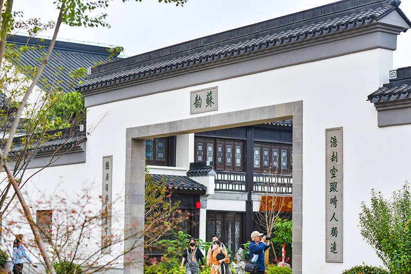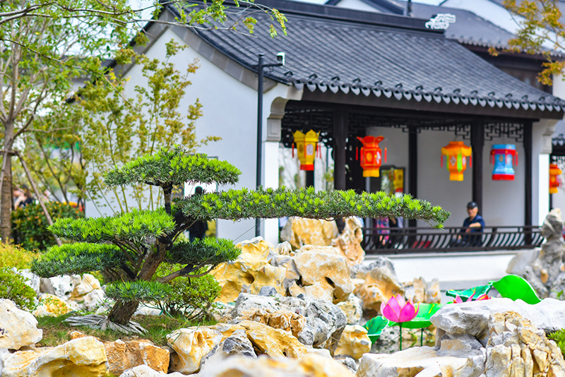 它是一处商业街区,汇聚了来自苏州的书香府邸旗舰店、宿迁本地特色店“金辉盛筵”、主打生猛海鲜的“渔舟村”、美味地道的苏帮菜馆“小园楼”等特色商户;它是一处园林景区,有“皱瘦漏透”的太湖石翼云峰、寓意长寿的涵碧轩山花、仿若仙境的蓬莱庭院以及粉墙黛瓦、飞檐翘角、垒石堆山、小桥流水等;它是一处文化社区,有老字号中医馆雷允上、凝结苏宿情谊的苏宿工业园区城市展览馆、展示“百匠赋新”的苏工苏作馆,汇集了苏州最具代表性的灯彩、核雕、宋锦、明式家具、船点、苏绣等手工艺作品。