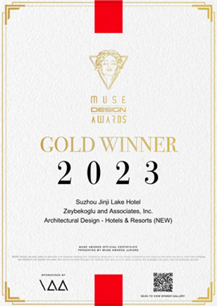 此次获奖是文华东方酒店地块项目继取得MUSE美国缪斯设计奖金奖LEED金级预认证后,获得的又一国际性权威认证。该项目位于金鸡湖右岸,整体设计从场地自身特性出发,将苏州传统文脉融入现代设计语境。其在设计上继承了传统园林藏筑于园的院落布局,酒店空间与湖岸景观相互蔓延渗透,用现代的设计表达构筑了一个全新的水岸园林,未来它将与苏州当代美术馆、苏州之眼摩天轮、苏州中环广场等组成的右岸区域“4+1”重点项目群,共同成为金鸡湖右岸文商旅新地标。